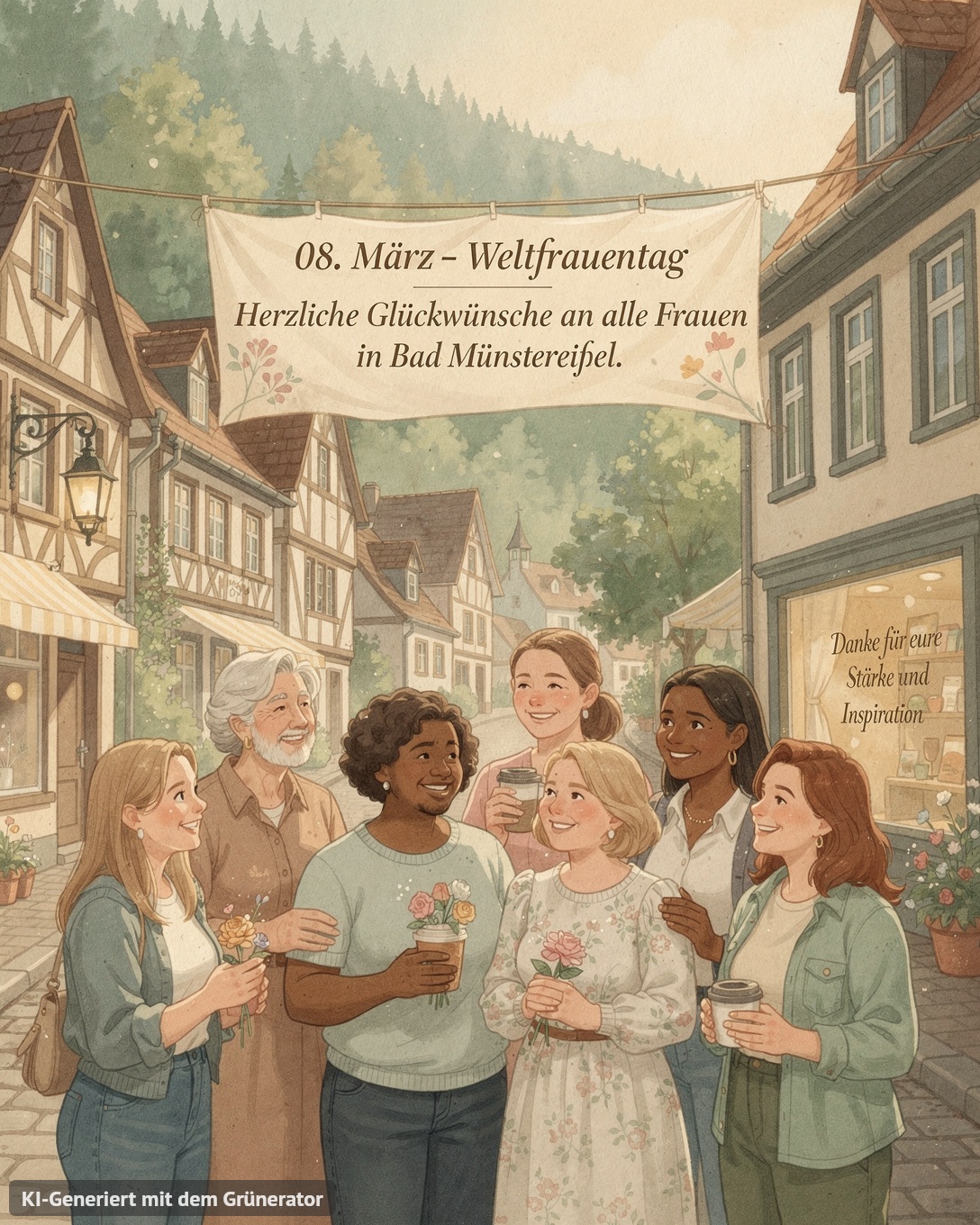 Der Weltfrauentag steht seit über einem Jahrhundert für den Kampf um Gleichberechtigung, Selbstbestimmung und die Anerkennung weiblicher Leistungen. Auch in Bad Münstereifel leisten Frauen täglich einen unverzichtbaren Beitrag – sei es in der Kindererziehung, der Pflege von Angehörigen, im Berufsleben oder in ehrenamtlichen und politischen Funktionen. Ihr Engagement ist das Fundament unserer Gesellschaft. Ohne den Einsatz von Frauen wäre unser Zusammenleben ärmer, weniger vielfältig und weniger gerecht.